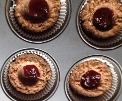 Den Backofen bei 175°C Umluft vorheizen. Zwei Muffin-Bleche mit Papier-Förmchen auslegen (wenn man nur ein Blech hat, dann muss man die Muffins hintereinander machen - macht dem Teig nichts, wenn er eine Weile ruht). Mit einem Eisportionierer fülle ich in jedes Förmchen ein Bällchen des Teiges. Danach mit einem Sektkorken (leicht mit Wasser anfeuchten) den Teig in die Form drücken und in der Mitte eine Vertiefung herstellen. In diese Vertiefung dann einen kleinen Kleks Marmelade geben (nicht zu viel, weil sonst die Marmelade beim Backen überläuft.