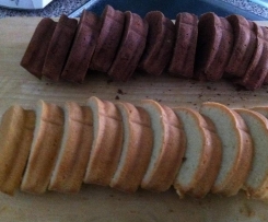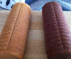 Ich habe allerdings keine Rehrückenformen. Deshalb habe ich ihn in zwei Kastenkuchenformen gebacken. Ich habe ihn dann aber nicht senkrecht in Scheiben, sondern waagrecht in jeweils 4 Böden geschnitten. Dann abwechselnd 2 dunkle und zwei helle Kuchenböden mit Creme zusammengesetzt und Schokoguss überzogen.