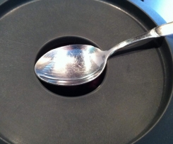 Den Schokoguß in eine hitzebeständige Schüssel geben und auf den Mixtopfdeckel mit dem Löffel stellen.