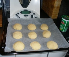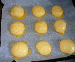"Mixtopf geschlossen" nehmen und in 9 gleiche Teile ( ca. 95 gr. pro Brötchen ) zu runden Brötchen formen. Das Ei mit dem Salz vermischen und die Teiglinge damit gut bestreichen. Dann 15 Min. /50-60° C im Backofen gehen lassen und 15 -20 Min. / 200°C / Ober-Unterhitze backen:Schmecken super lecker mit selbstgemachten Frischkäse und Aprikosenmarmelade. Oder einfach im Milchkaffee tunken.