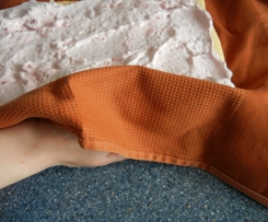 Dann lege ich den Boden so auf ein Geschirr-/Trockentuch, dass die schöne Seite nach unten zeigt und bestreiche ihn mit der Füllung.