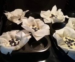 Vanillepuddingpulver mit der Milch kurz auf Stufe Turbo vermixen. Magerquark, Frischkäse, Ei, Zitronensaft und Zucker zugeben und 1 Min./Stufe 4 verrühren. 5 Lagen Filoteig in vier Teile schneiden, so dass es 20 Quadrate ergibt. Immer mindestens 2 Teile Filoteig in eine Muffinform geben und vorsichtig nach unten drücken, dass er nicht reißt. Quarkcreme gleichmäßig auf die Förmchen verteilen. Heidelbeeren waschen und auf der Quarkmasse verteilen.