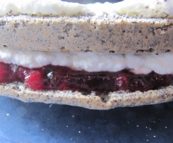 Ca. 2/3 der Schlagsahne auf den Preiselbeeren verteilen. Den zweiten Boden auflegen und die Torte mit der restlichen Sahne bestreichen (es reicht auch nur oben drauf).