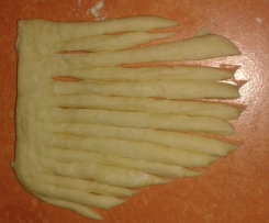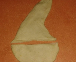 Teig länglich ausrollen. Im unteren Bereich etwas runder, dann vom unteren Teil für den Bart ein Stück abtrennen.