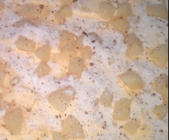 Kleingeschnittene Birnen darauf verteilen, die 2 Vanillezucker gleichmäßig darübergeben und dann das Nuss-Zuckergemisch darüberstreuen.