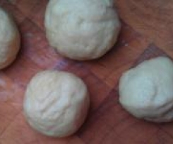Nachdem der Teig gegangen ist nochmals kurz durchkneten. Mit einem Teigspatel ca. 20 gleich große Stücke abtrennen und auf der Handfläche rund rollen.