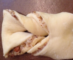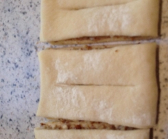 "Mixtopf geschlossen" 5 Sek/Stufe 7 zerkleinern (dürfen ruhig noch "Biss" haben). Restliche Zutaten zufügen und 20 Sek./Stufe 3 vermischen.Hefeteig zu einem Rechteck (ca. 35 x 50 cm) ausrollen und mit der Füllung bestreichen. Rechte und Linke Seite jeweils bis zu Mitte umklappen und entlang der "Mittelnaht" durchschneiden (klappt prima mit einem Pizzaschneider!). Nun die gefüllten Rechtecke in 6 Streifen teilen.