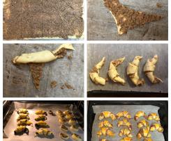 2. Abgekühlte Maße auf die 4 Blätterteigeverteilen, in je 16 Dreiecke schneiden und dann zu einem Hörnchen aufrollen.
