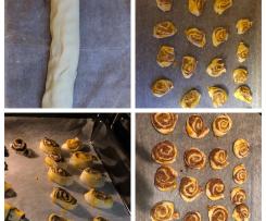 5. Fertige Hörnchen mit Puderzucker bestreuen - Man kann auch ganz einfach kleine Schnecken daraus machen. Einfach Blättertteig an der längsseite aufrollen und mit dem Teigschaber kleine Schnecken abstechen unf auf das Backblech legen. Genauso weiter vortfahren, wie mit den Höhrnchen