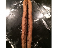 7. Den Teig von der langen Seite her aufrollen und die Rolle der Länge nach halbieren.