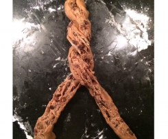 8. Die zwei Stränge miteinander verschlingen und den fertigen Zopf auf ein mit Backpapier belegtes Blech legen.