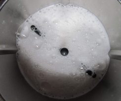 Die Sahne noch ca. 40 Sek. / St. 3 weiter schlagen (der Spritzschutz ist nicht mehr nötig). Dabei durch die Deckelöffnung kontrollieren, ob die Spuren des Rühraufsatzes am Rand der Sahne zu sehen sind, dann ist die Sahne fertig.