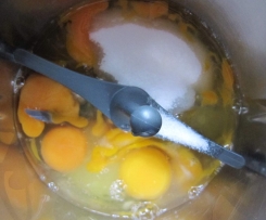 Rühraufsatz einsetzen. Eier, Wasser und Zucker in den
