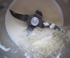 "Mixtopf geschlossen" wiegen und 2 Min. / 50 °C / St. 2 erwärmen (die 50 °C müssen nicht erreicht werden). Die Gelatine ausdrücken und zu der Milch geben.