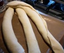 Den Teig in drei Teile teilen und jeden auswellen. Nußfüllung aufstreichen und zusammenrollen. Dann die drei Stränge zu einem Zopf formen.