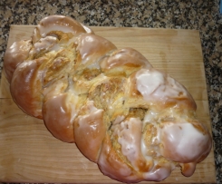 Für den Zuckerguß Puderzucker, einige Tropfen heißes Wasser und Aroma miteinander zu einem dickflüssigen Brei verrühren und auf dem kalten Zopf verteilen!
