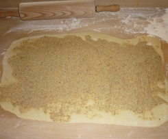 Habe nur fast die doppelte Menge an Füllung genommen (Zucker nicht erhöht), da gerade die Nüsse das Leckere sind. Masse war ziemlich klebrig. Aber durch die 3 Rollen hat es sich verteilt. Für den Guss war keine Zeit mehr, da die Family vorher drüber hergefallen ist.