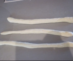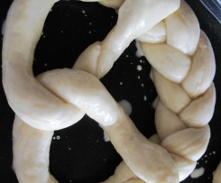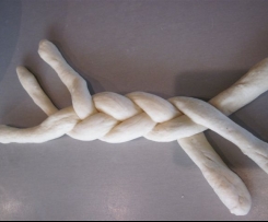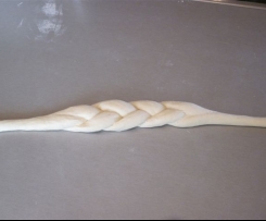 Jedes Teigstück nochmal in 3 Teile teilen und zu langen Rollen formen. Dann in der Mitte des Teiges einen Zopf flechten. Die Ränder wieder zusammenrollen.
