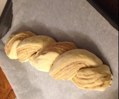 Nochmals gehen lassen. Dann mit Ei bestreichen und bei mittlerer Hitze 190 Grad Ober- Unterhitze für 25-30 Min. backen.