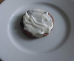 9. Törtchen mit ca. 1/2 Eßlöffel Creme bestreichen und mit kleingeschnittenen Obststücken belegen
