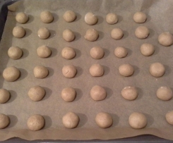 Nun aus dem Teig mit bemehlten Händen kleine Kugeln formen und mit etwas Abstand auf ein mit Backpapier ausgelegtes Backblech legen. - Nun die Bleche einzeln abbacken.