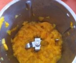 Die Pfirsiche im Garkörbchen gut abtropfen lassen. In den gespülten Mixtopf geben und mit Sichtkontakt ca. 3-4 Sek/Stufe 3-4 zerkleinern. Dann auf den Tortenboden geben.