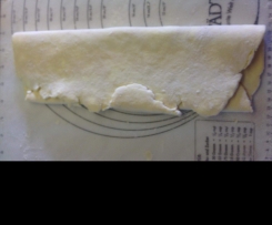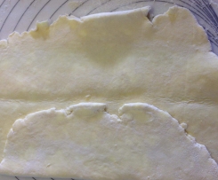 Den Blätterteig aus dem Kühlschrank holen und ausrollen (nur so groß ausrollen, dass er auf ein Backblech passt, er sollte mindestens 5 mm dick sein)