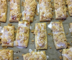 Vielleicht ist es einfacher, wenn man den Blätterteig im Ganzen auf das Backblech gibt, einstreicht, die Streusel darauf verteilt und erst nach dem Backen zerschneidet.