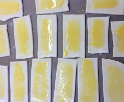 In 16 -18 Rechtecke schneiden und mit dem Milch/Eigelbgemisch einpinseln, die Kanten frei lassen.