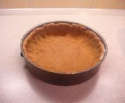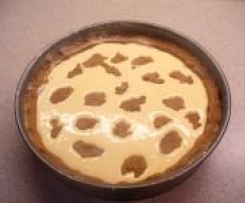 Den Teig aus dem Kühlschrank nehmen und in eine Springform umfüllen, etwas Teig zurückhalten. Mit der Hand (am besten etwas nass) gleichmäßig verteilen und dabei den Teig etwas am Rand hochdrücken (etwa 1,5 cm). Dann die Füllung in die Form gießen. Den Rest Teig zupft man zu Streuseln und verteilt diese über den Kuchen.