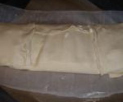 Die zweite Teigplatte 1x der Länge nach durchschneiden und die eine nochmals teilen ( siehe bitte Foto) - diese Stücke werden angesetzt. Das lange Stück an die lange Seite ansetzen und die beiden kurzen Stücke zum Einklappen jeweils an die Seiten ansetzen.