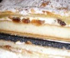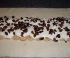 Die Löffelbisquits in die Mitte legen hierauf die Quarkfüllung & ggf. die Rosinen verteilen.
