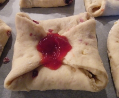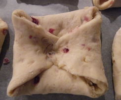 Jetzt wird der Teig ausgerollt und in 12 Stück 12x12 cm große Quadrate ausgerädelt. Die Ecken dieser Quadrate werden zur so Mitte eingeschlagen, dass sie aufeinander treffen.