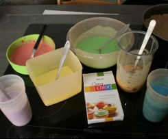 Creme auf entsprechend viele Schälchen verteilen und mit den unterschiedlichen Farben einfärben