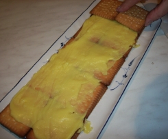 4--Nun die Kekse tauchen in lauwarme Milch ,nicht zu heiß ! und dann in einer Reihe auf eine Kuchenplatte legen , Kekse in der Milch --und die Creme mit einem Messer glatt streichen -------nach und nach Kekse tauchen in der Milch und die Creme .. ((und 8 Stufen Kekse ))