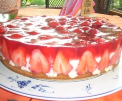 Den roten Tortenguss nach Anweisung ---ich nehme immer etwas weniger Wasser --kochen , leicht erkalten lassen und über die Erdbeeren gießen . .......Bis zum Verzehr mindestens 2 Stunden kühlen ..