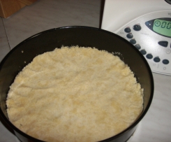 " Modus „Teig kneten“" 2. Eine Springform ( 28 cm ) mit Bakpapier und die ((( Hälfte ))) des Streusel ein füllen festdrücken !! und die Pfirsiche abtrofpen und mit der Wölbung nach oben hineinlegen. und ((( MT gut säubern )))