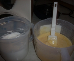 "Mixtopf geschlossen" steif schlagen Stufe 3 ./bis Konturrn an der inneren Mixtopfwand sichtbar werden und umfüllen.5. Schmetterling entfernen Magerquark,Zucker,Eigelb,Salz,Vanilezucker und den Puddingpulver in den Mixtopf
