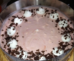 Zum Schluss Tortenring vorsichtig entfernen und mit übriger Cremefine und Schokostreuseln garnieren.