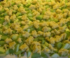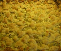 Dann den geputzen und in kleine Stücke geschnittenen Rhabarber drauf verteilen, und den Zupfer in drüber geben.