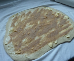 " Modus „Teig kneten“" kneten und an einem warmen Ort zugedeckt etwa 1 Stunde gehen lassen. - Teig ungefähr rechteckig ausrollen. Mit der Hälfte der Butter bestreichen und die Hälfte des Zimt und Zuckergemischs gleichmäßig aufstreuen.