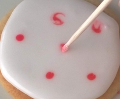 1. Auf die ausgekühlten Kekse mit dem weißen Royal Icing eine runde Fläche spritzen und mit einem Schaschlickspieß ebenmäßig auf dem Keks verteilen, indem man Kreißbewegungen macht.