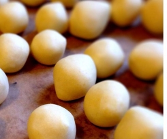 - Mit den Fingern ein bisschen Teig abnehmen und in den Handflächen zu einer Kugel drehen (ca. Murmelgröße).