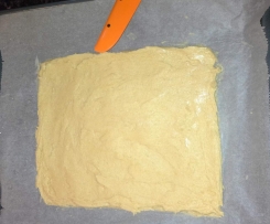 Den zugegeben etwas klebrigen Teig auf ein mit Backpapier vorbereitetes Backblech streichen wie auf dem Foto.