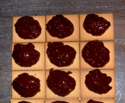 Die Hälfte der Butterkekse mit der schönen Seite nach unten auf die Arbeitsfläche legen.