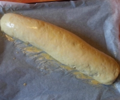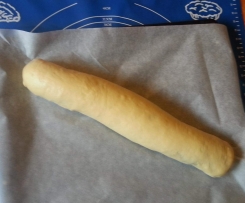 Eigentlich wird die Rolle in einer Kastenform gebacken, aber da wie ihr seht der Teig sehr gut aufgeht, habe ich ihn dieses Mal auf dem Backblech gebacken (das kann jeder so machen wie er will - die Kastenform sollte aber mindestens 30 cm lang sein).