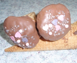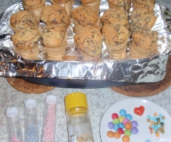 5. Die Vollmilch- oder Kakaoglasur je nach Herstellerangaben erwärmen und die ausgekühlten Kuchen-Eistüten kurz in die Glasur tunken und sofort nach belieben mit Schokostreuseln, Zuckerperlen, Smarties, Schaumzuckerfruchtgummi, ... verzieren.