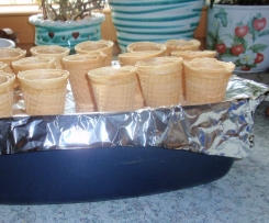 1. Eine Form (z.B. Alugußbräter) mit Alufolie doppelt bis dreifach überziehen und Löcher hineinschneiden. Die leeren Eistüten hineinstellen.