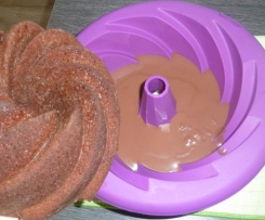 Wenn der Kuchen komplett ausgekühlt ist, die 500g temperierte Schokoladenglasur ca. 32°C (siehe TIPP) in die Form geben und den Kuchen wieder einsetzten und vorsichtig andrücken...