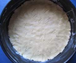 7. Herd auf 200 °C Ober- / Unterhitze vorheizen. 26er-Springform fetten, den Mürbeteig auf dem Boden verteilen und mit einer Gabel mehrmals einstechen.